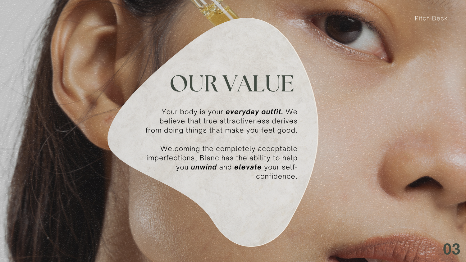 Your body is your everyday outfit. We believe that true attractiveness derives from doing things that make you feel good. Welcoming the completely acceptable imperfections, Blanc has the ability to help you unwind and elevate your self-confidence.”