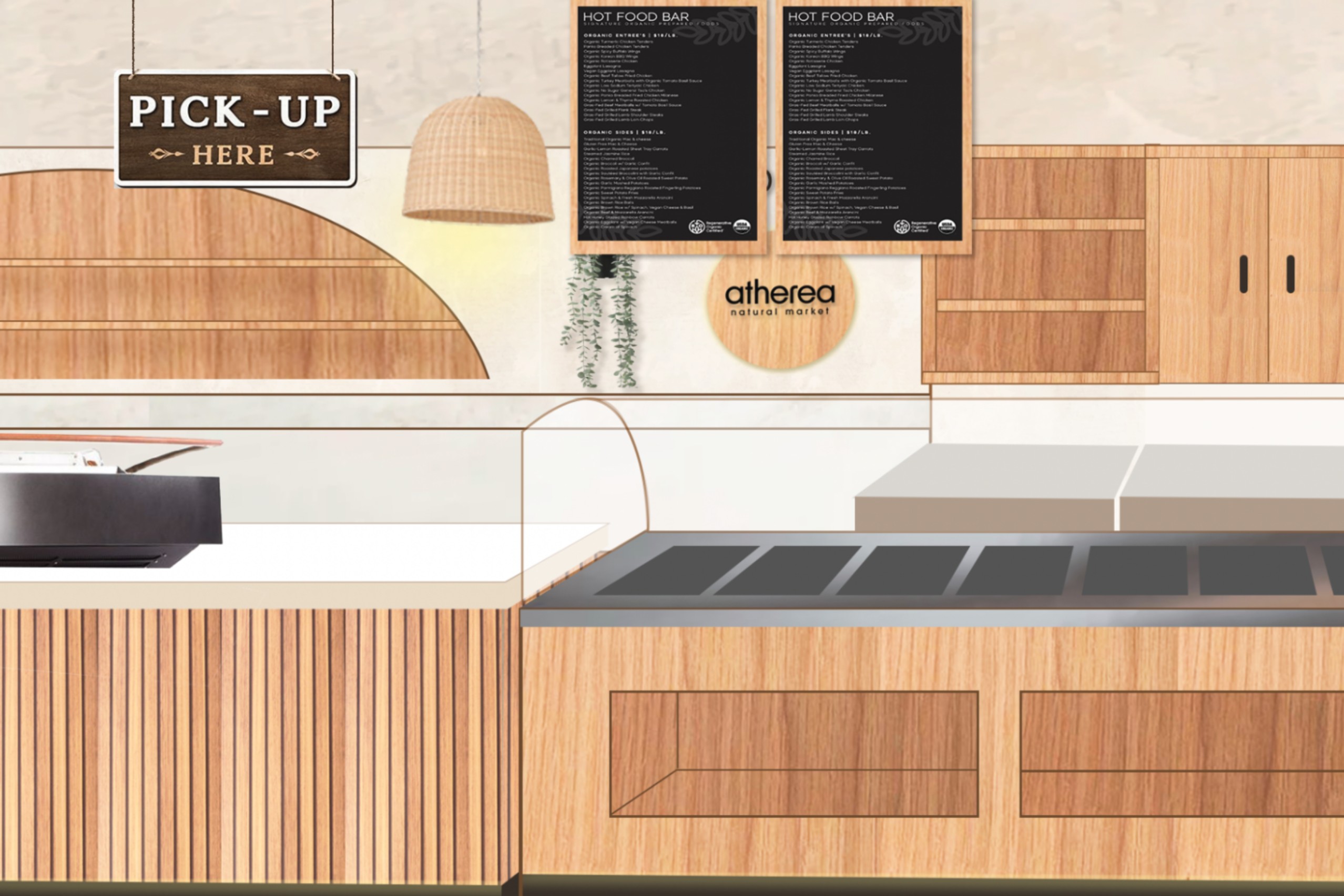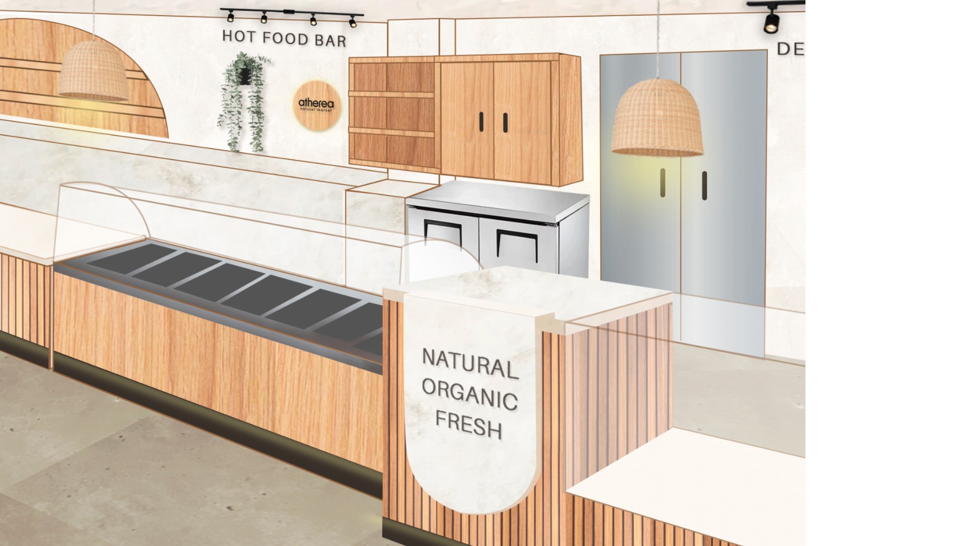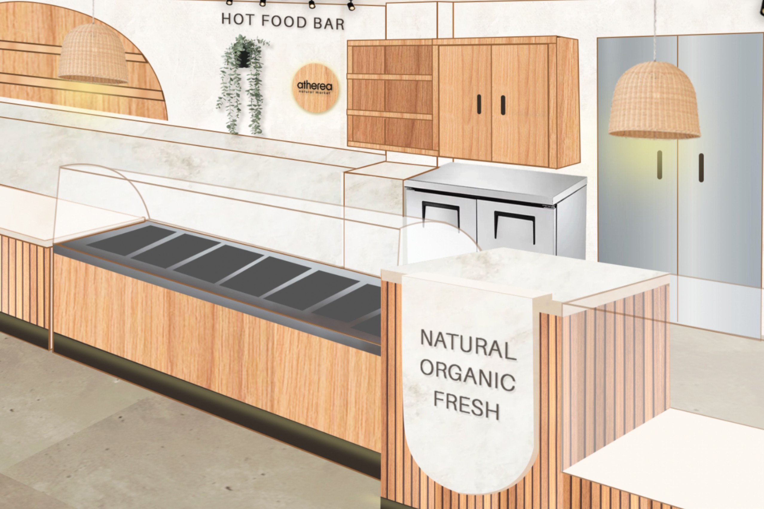 The design introduces Atherea as a fresh sub-brand, targeting a younger audience that prioritizes organic living, wellness, and intentional food choices. Rather than competing with conventional supermarket aesthetics, the space is positioned as a more curated, lifestyle-oriented grocery experience.