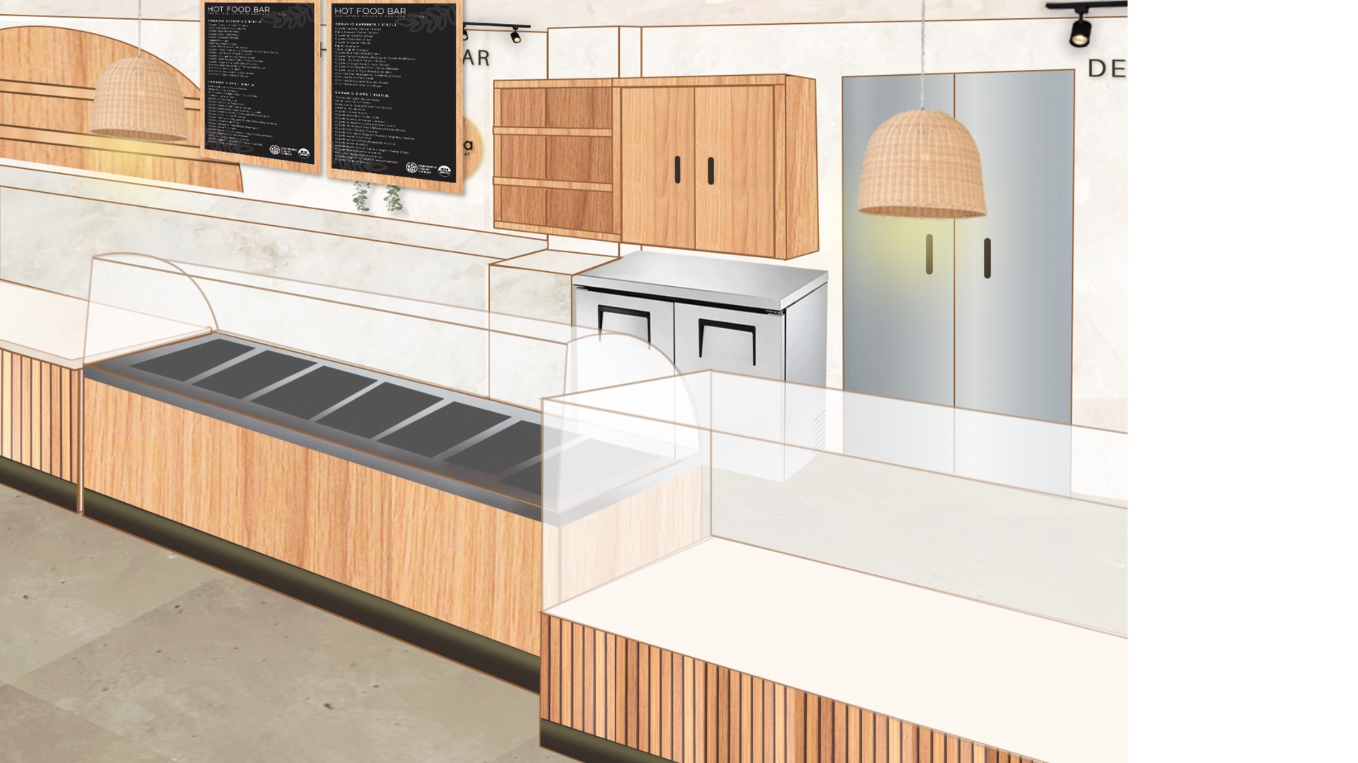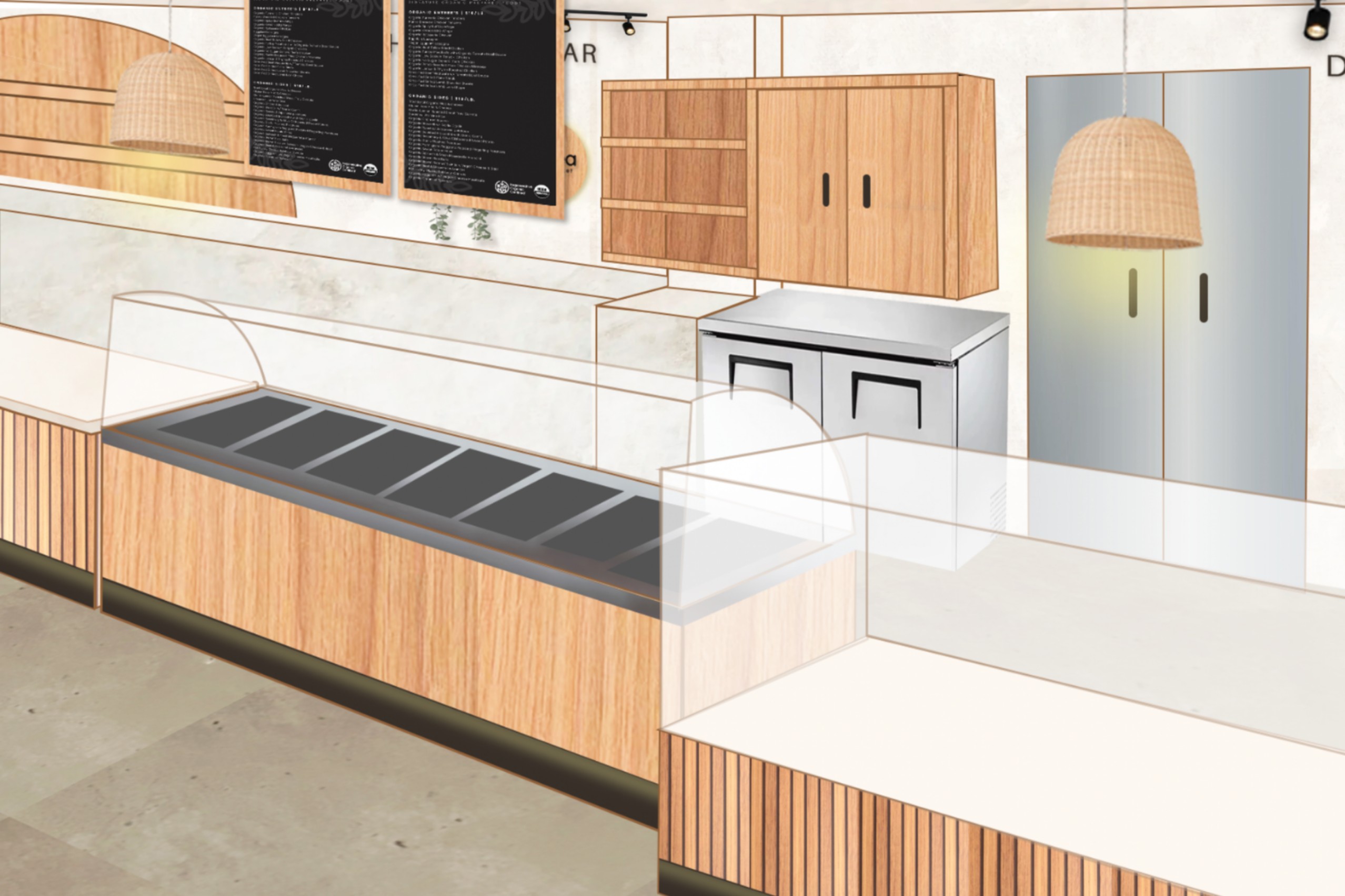 Materiality plays a central role in expressing this shift. Warm wood tones and limewash finishes define the interior, creating a soft, natural backdrop that evokes an organic and grounded atmosphere. A newly introduced salad bar serves as a focal point—both functionally and visually—reinforcing the brand’s emphasis on fresh, healthy offerings.