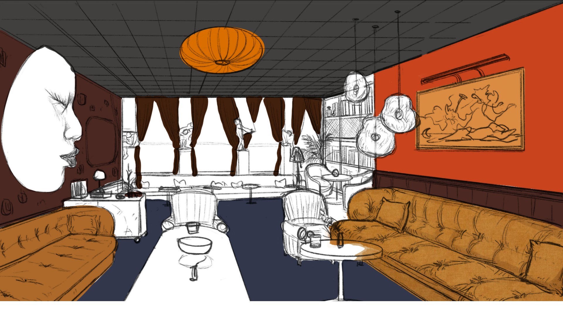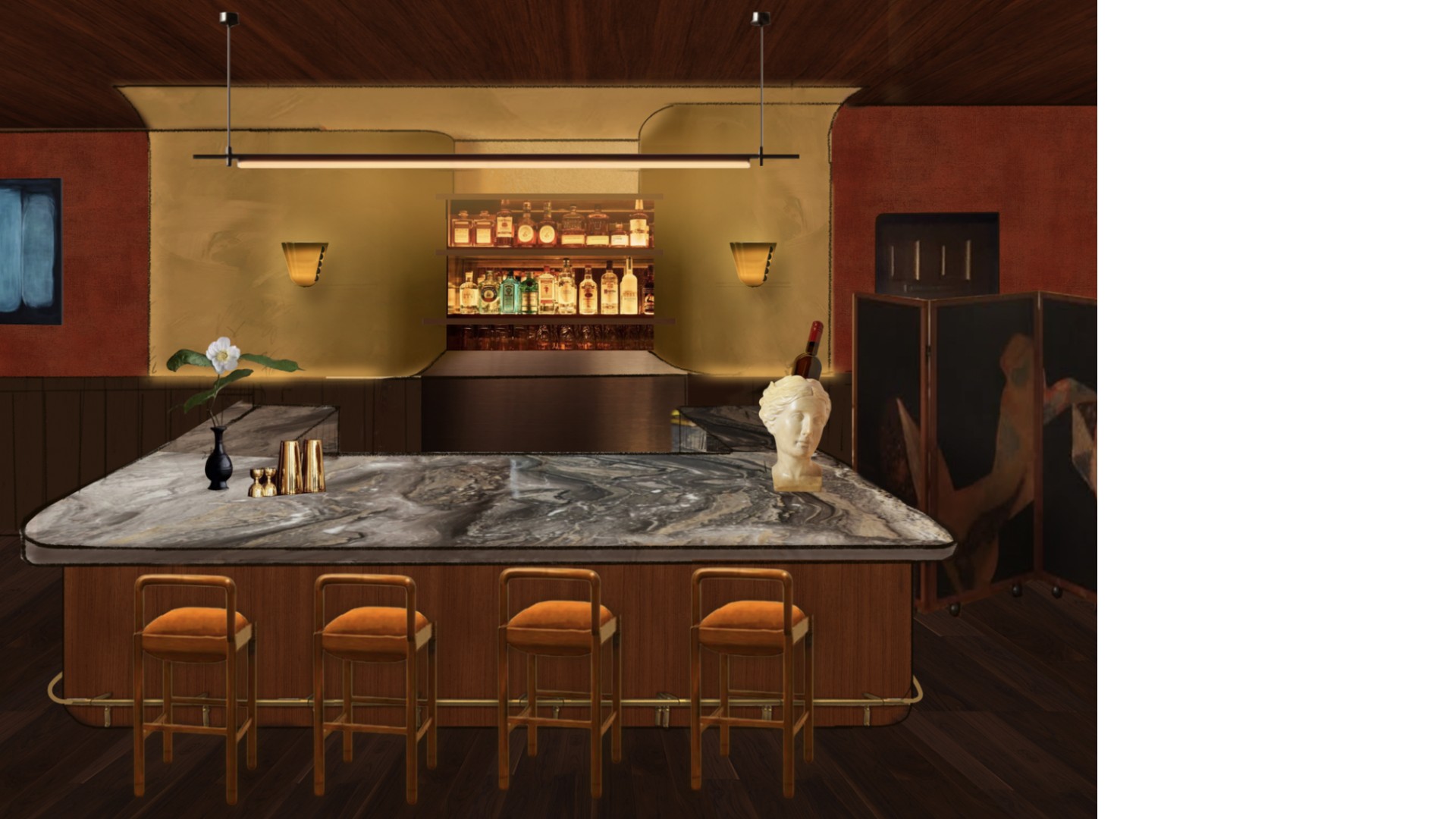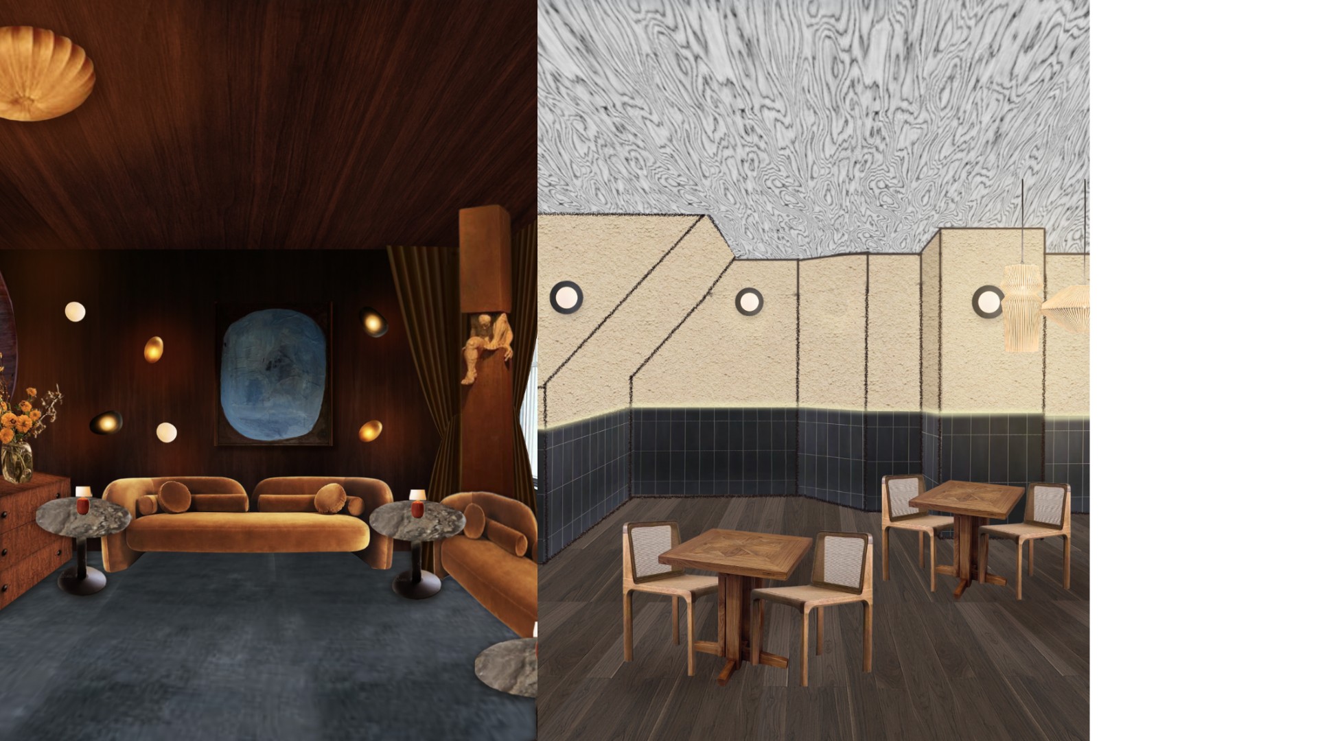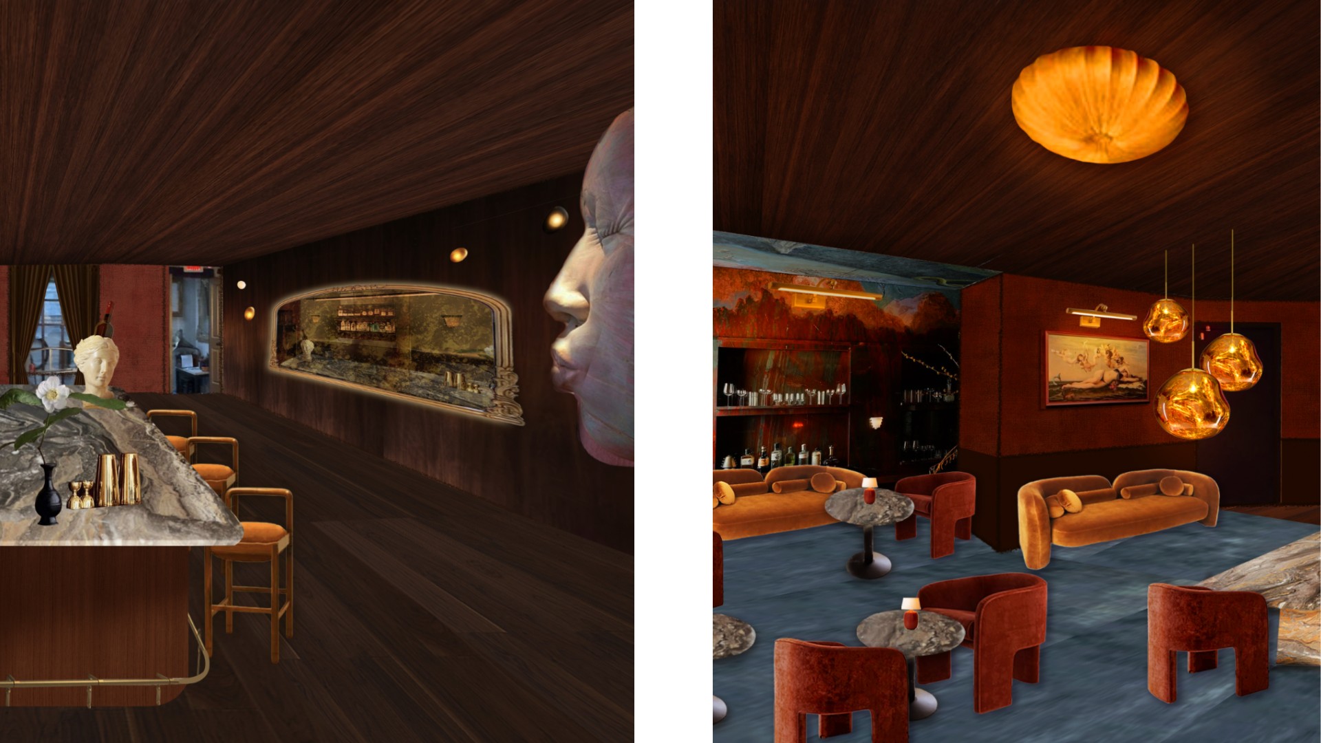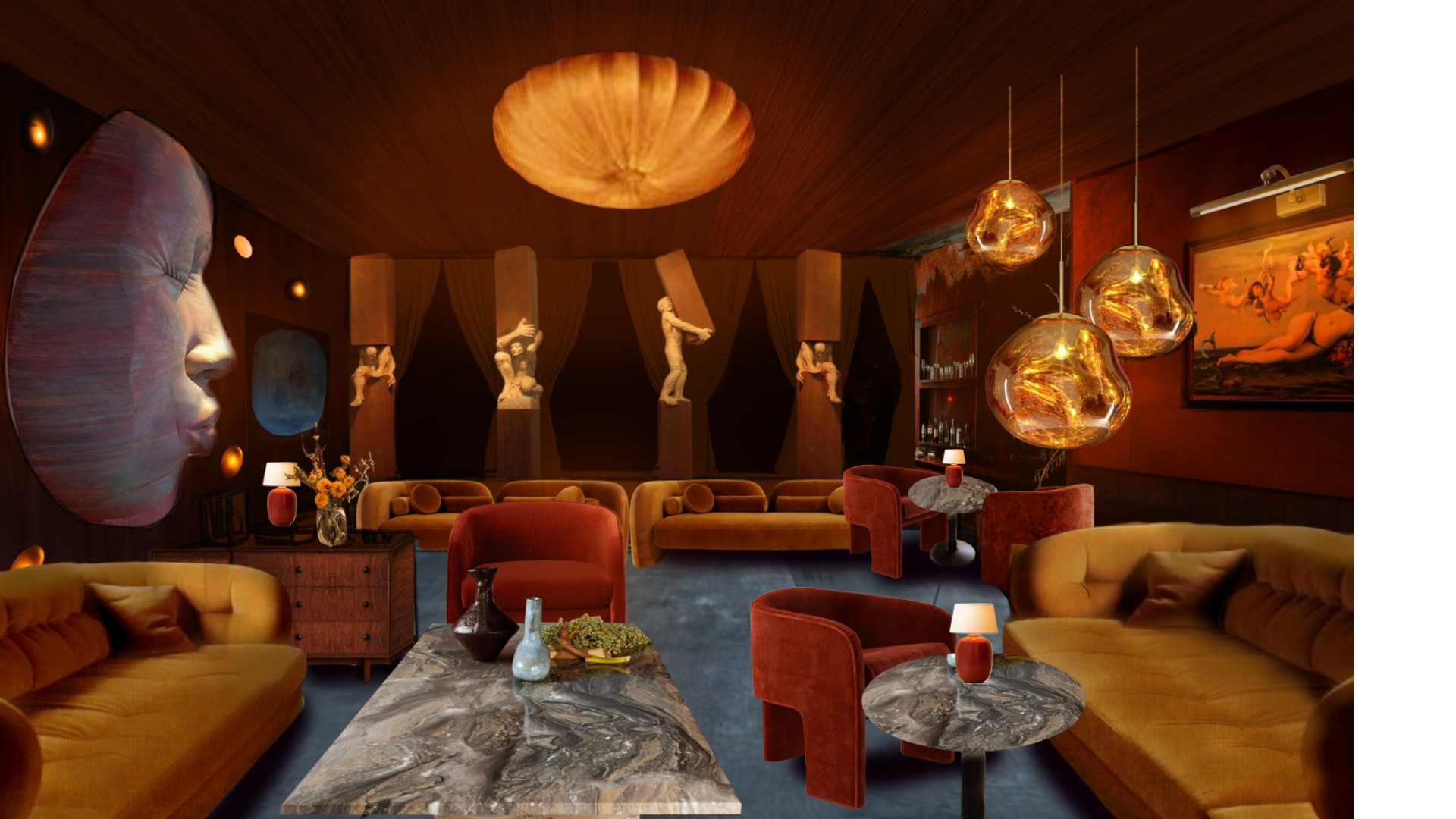 In contrast, the upstairs speakeasy introduces a more refined and curated experience. Inspired by the ambiance of an art collector’s private residence, the space leans into a low-key luxury—layered, intimate, and slightly enigmatic. Rich materials, controlled lighting, and carefully selected art elements define the environment, creating a sense of discovery and exclusivity while maintaining a subtle connection to the narrative below.