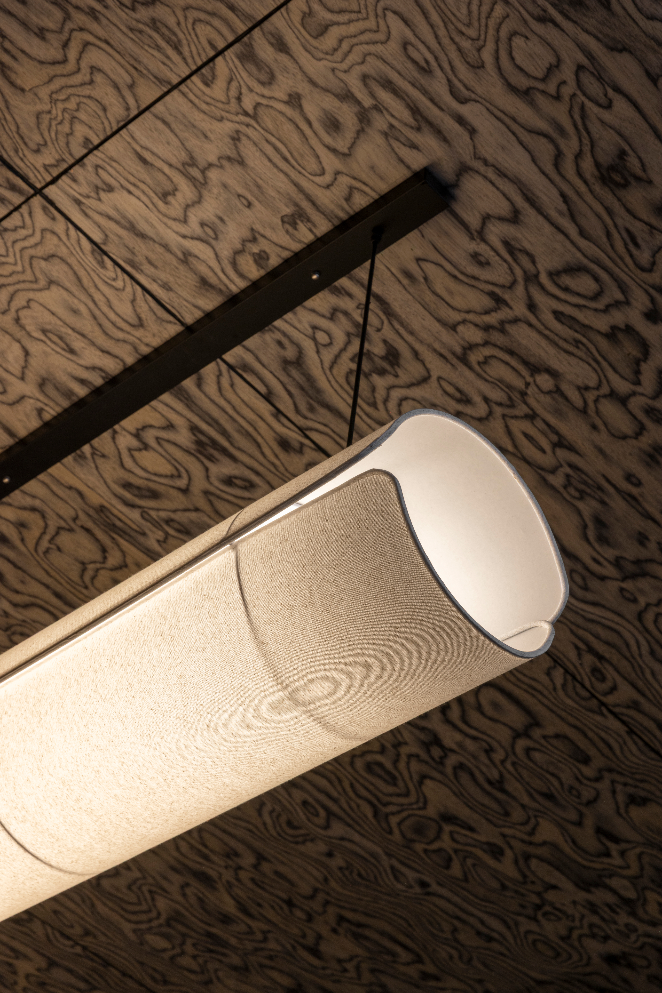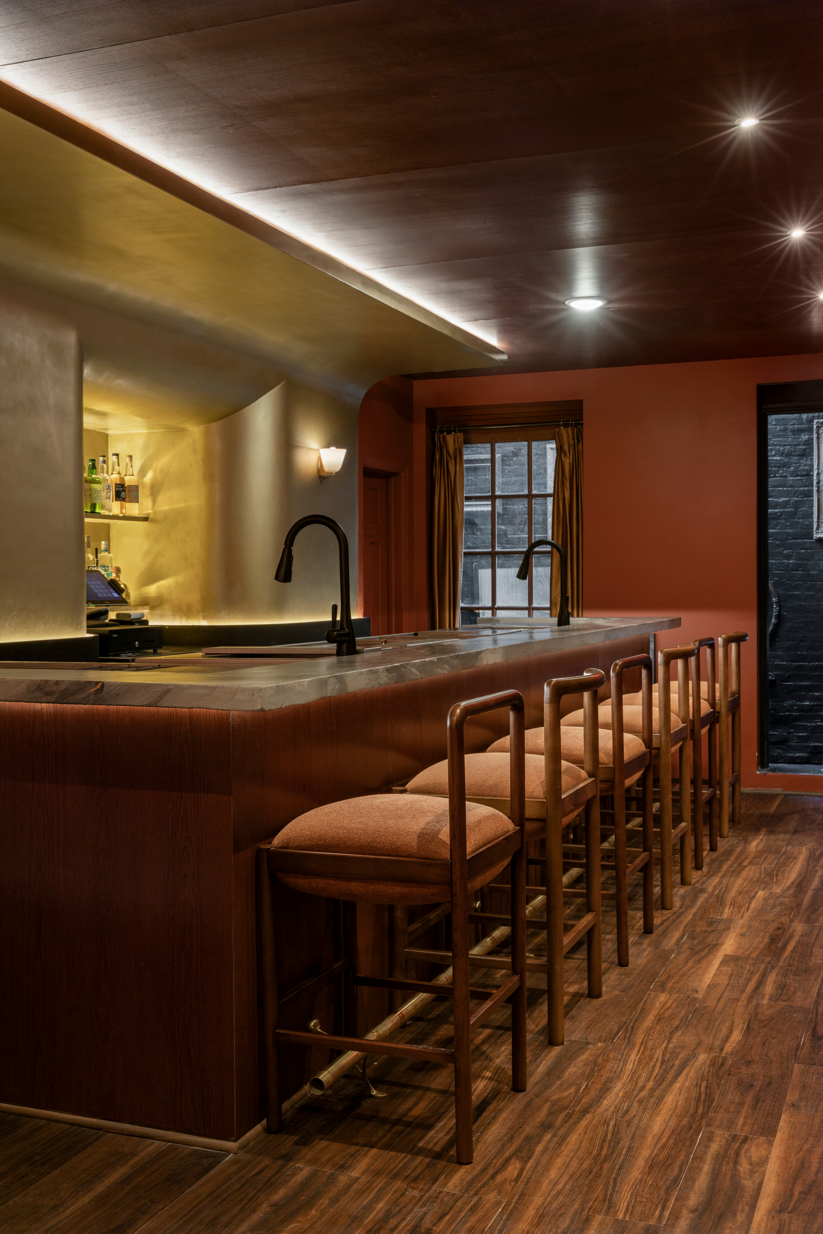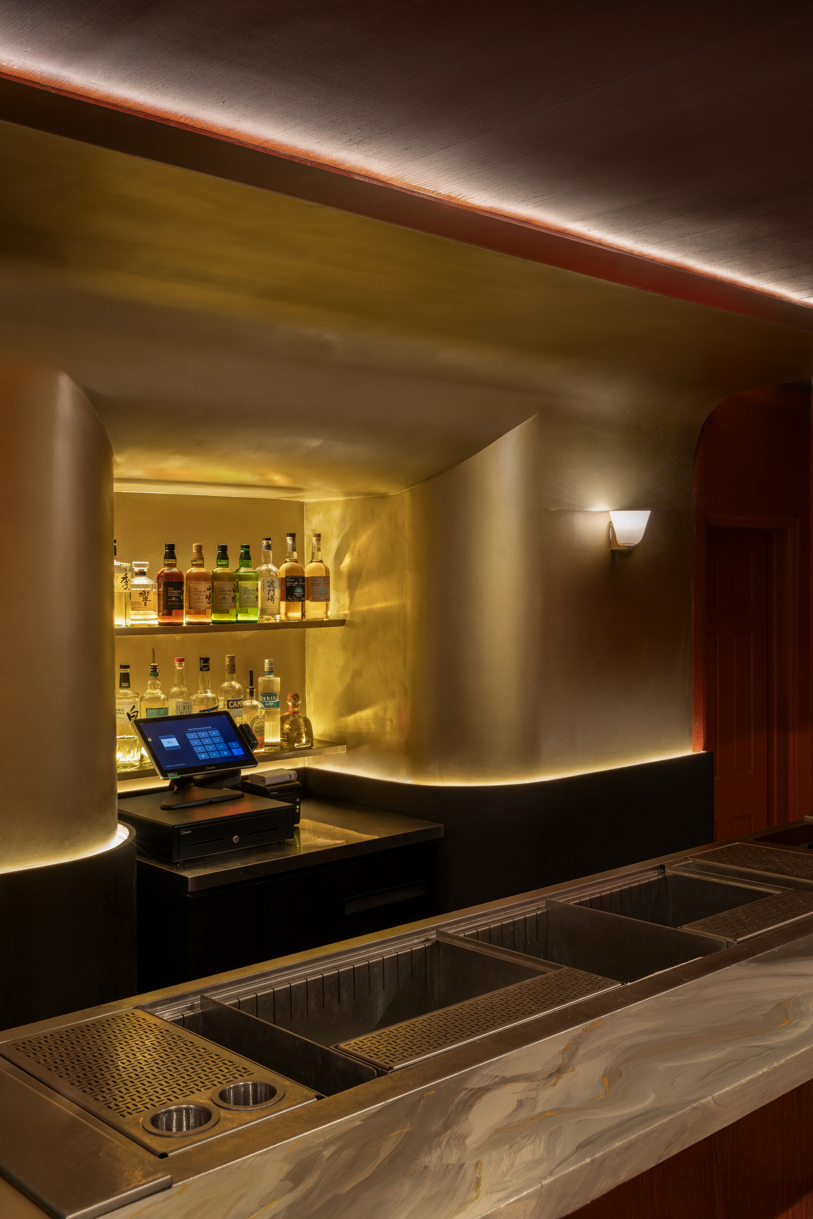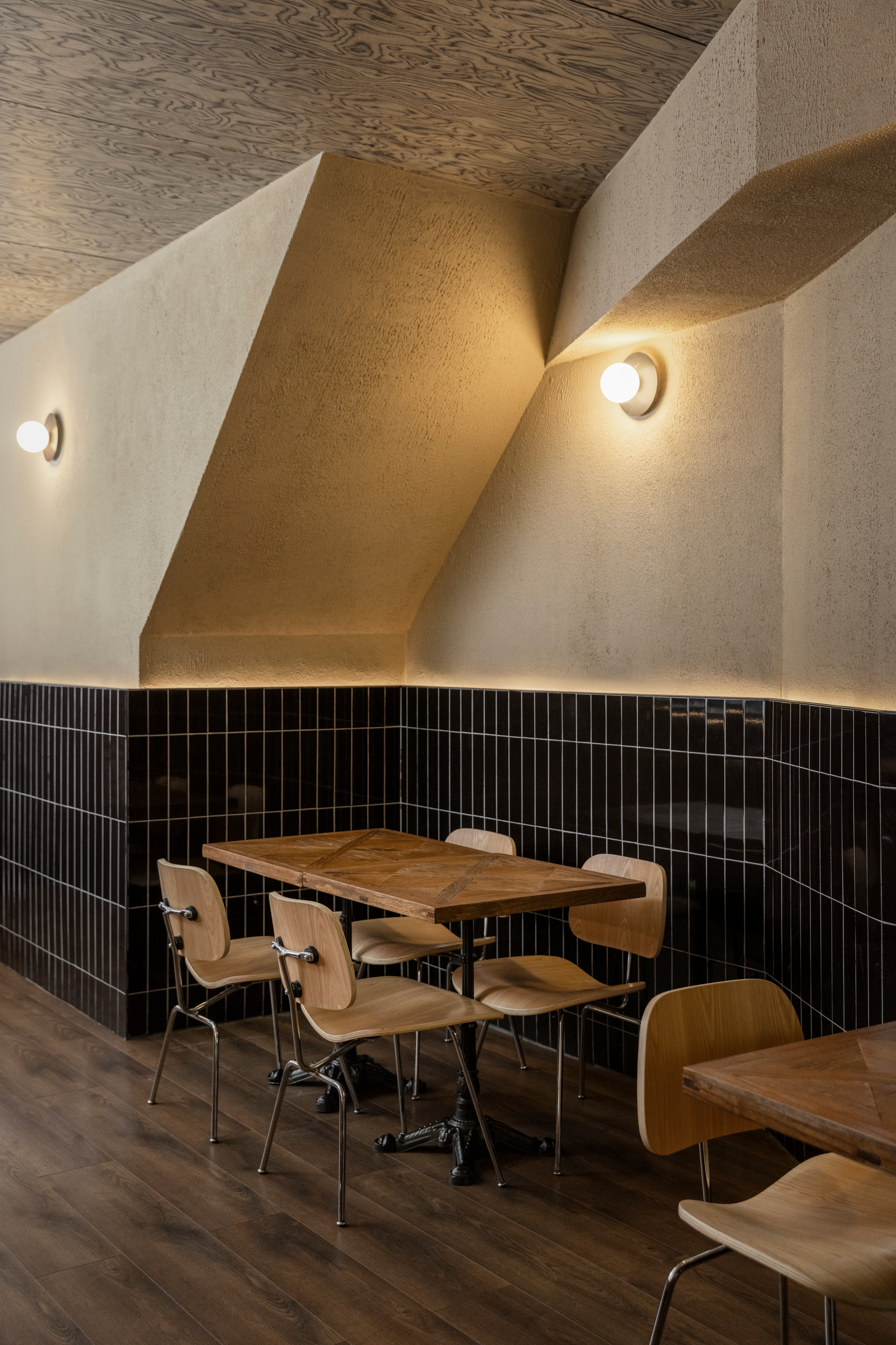 The downstairs space focuses on evoking the essence of a traditional Japanese izakaya—warm, unpretentious, and deeply rooted in everyday culture. The design emphasizes natural materials such as walnut wood, textured plaster, and soft ambient lighting to create a sense of familiarity and comfort., capturing the spirit of neighborhood dining in Japan.