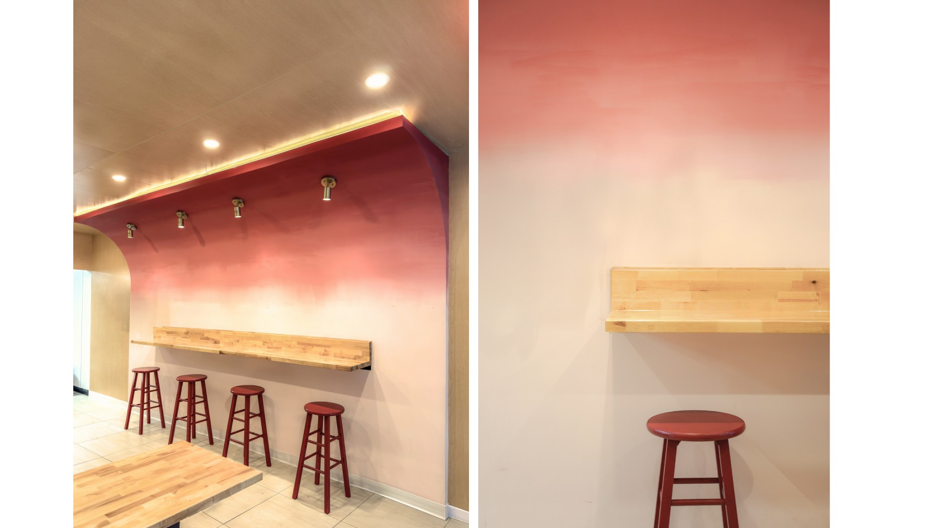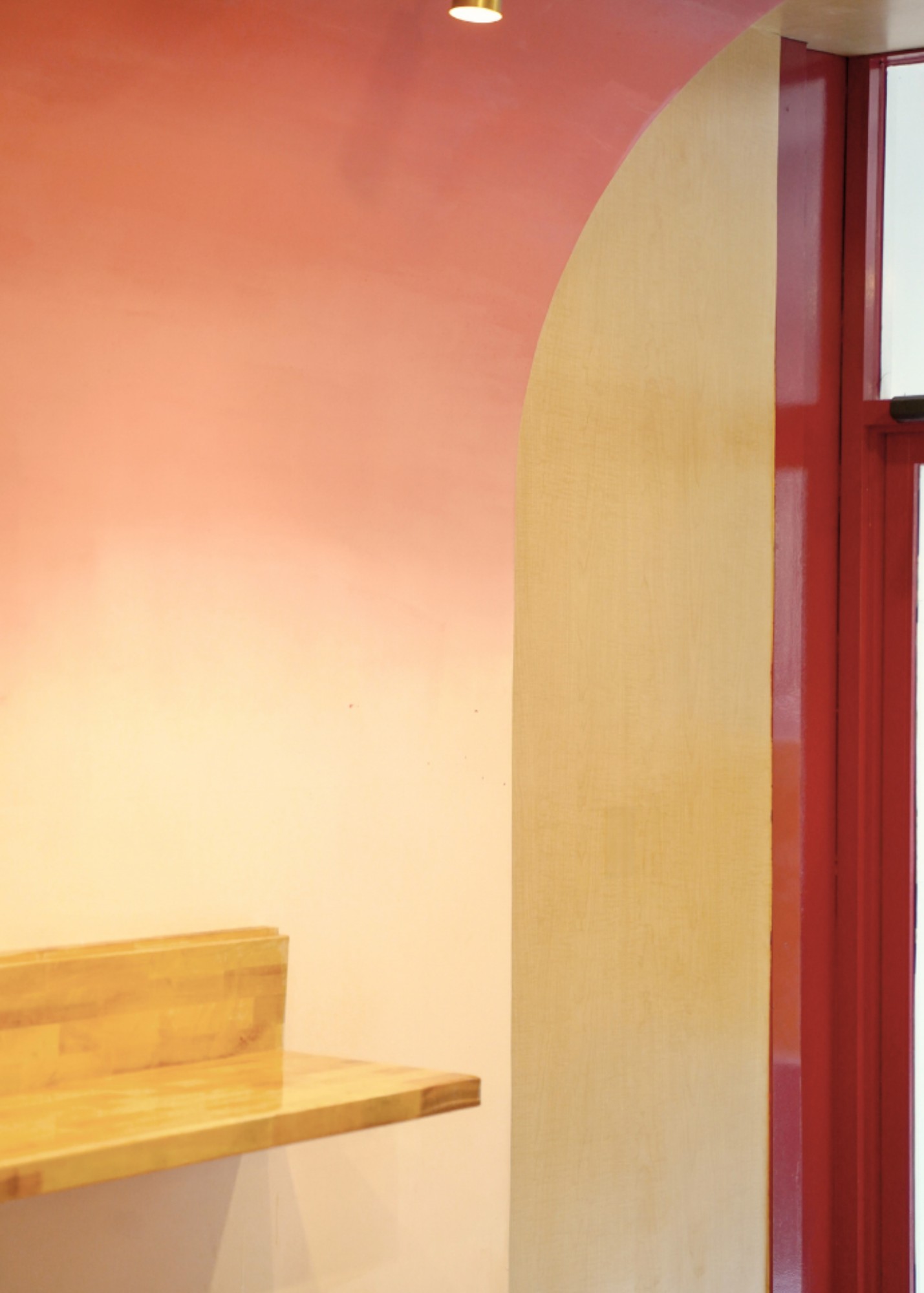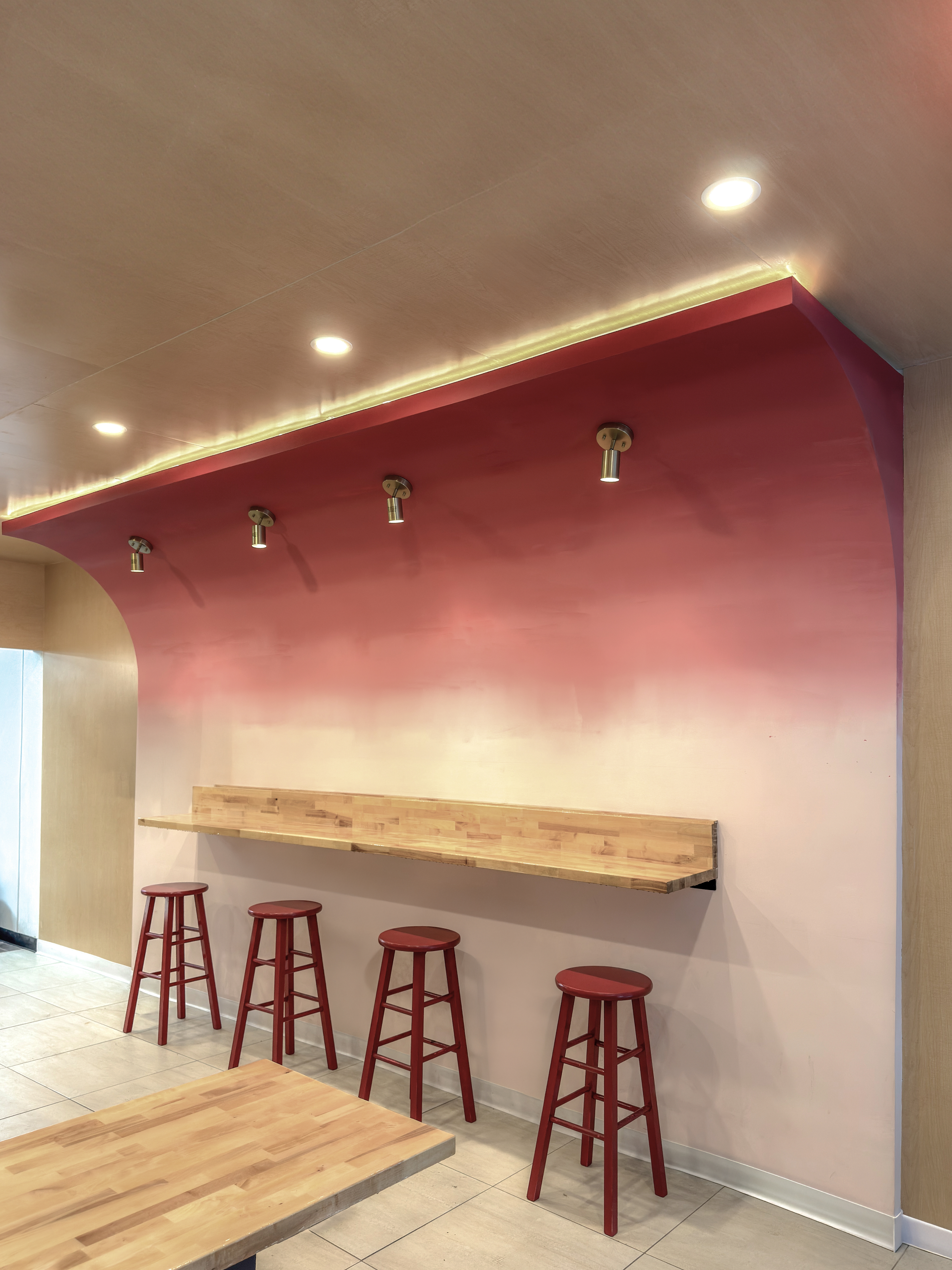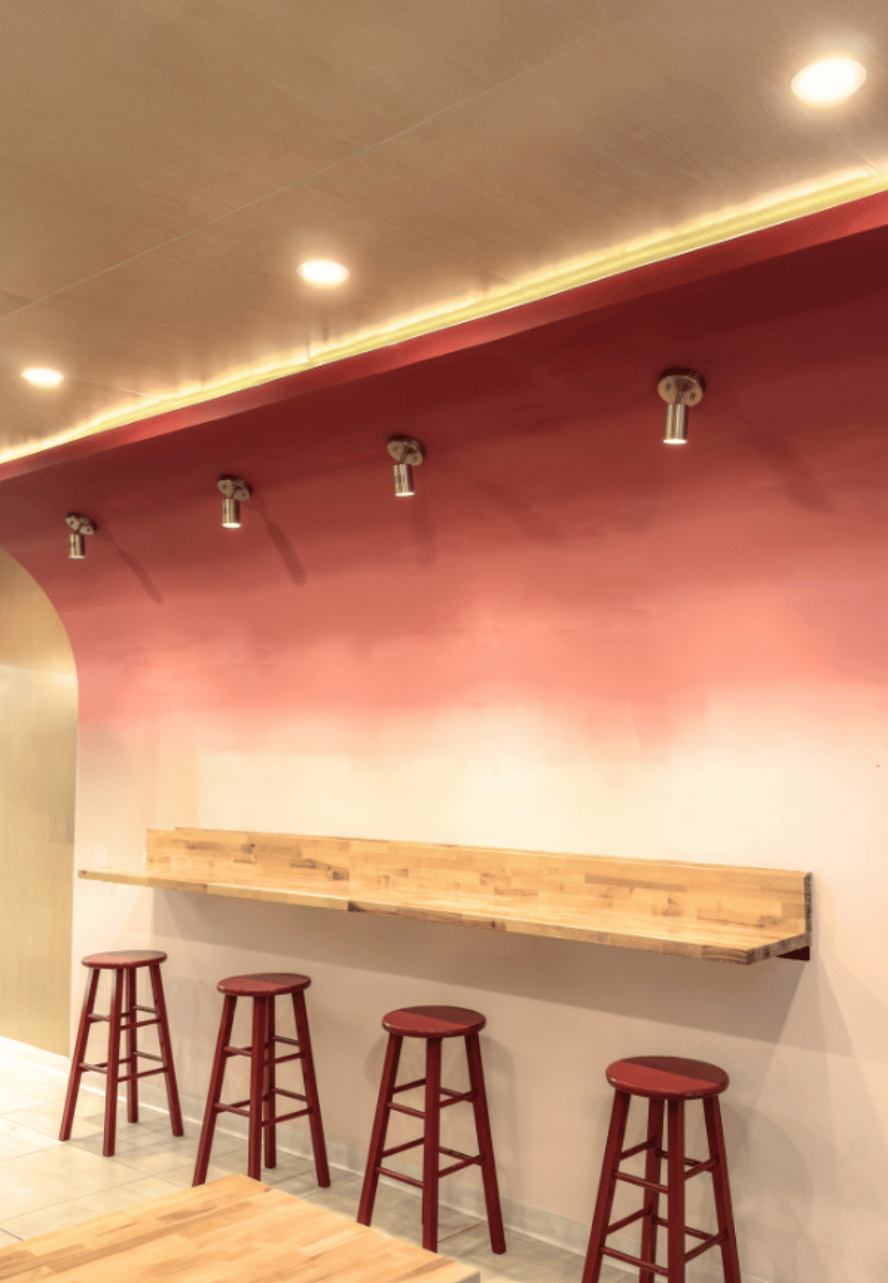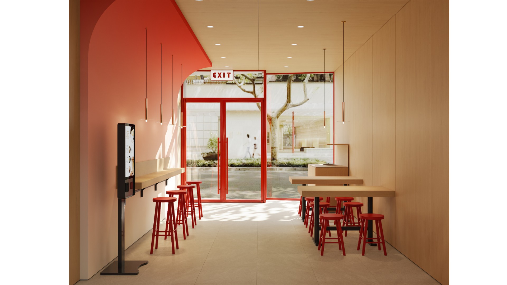 The space is carefully composed to resonate with office professionals seeking a sense of ease and familiarity during their daily routines. A signature red gradient wall anchors the interior, introducing warmth and subtle energy while creating a strong visual identity. This is balanced by light wood tones and soft material finishes, which bring a sense of calm, approachability, and home-like comfort.