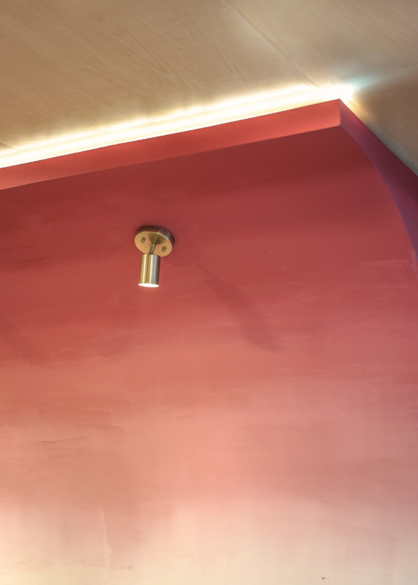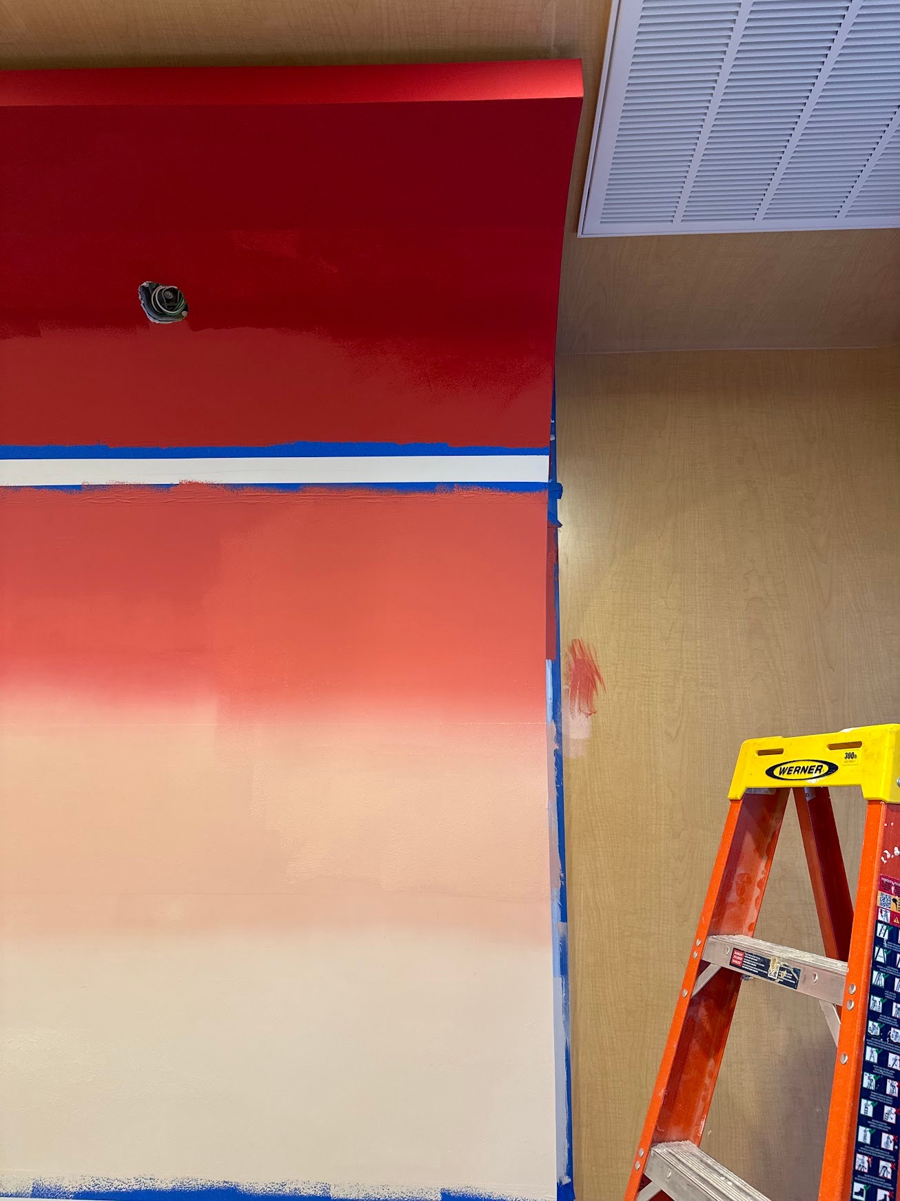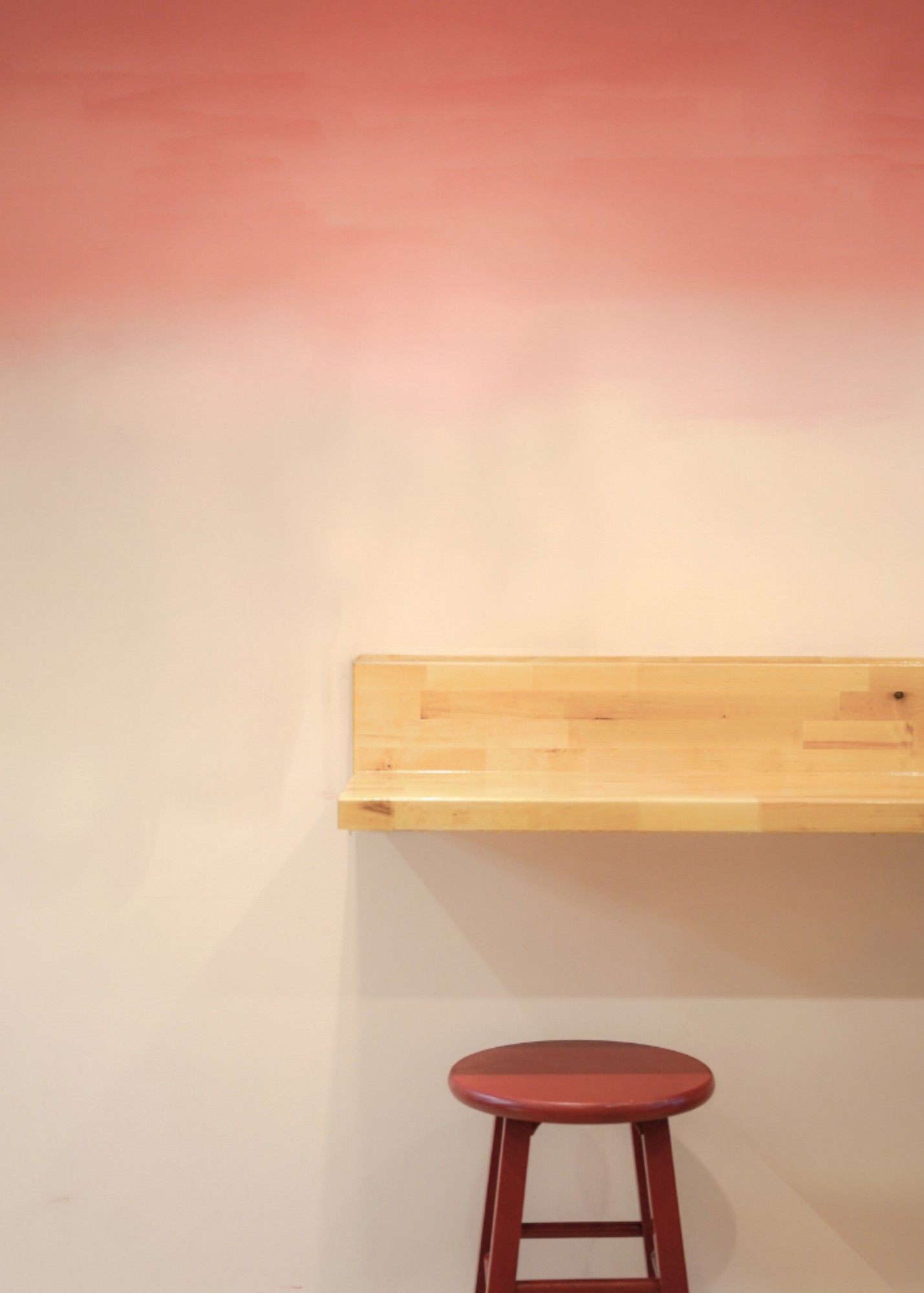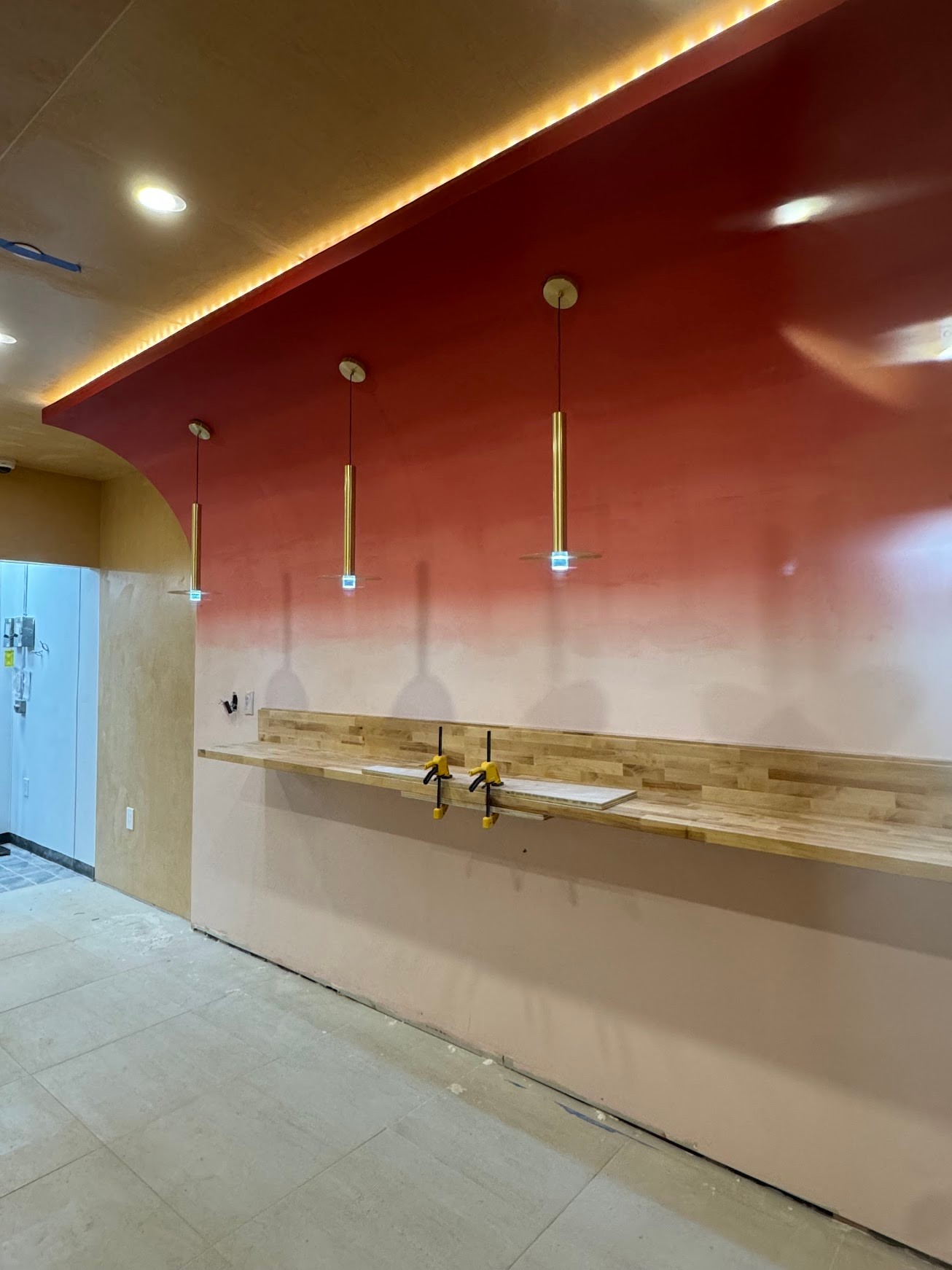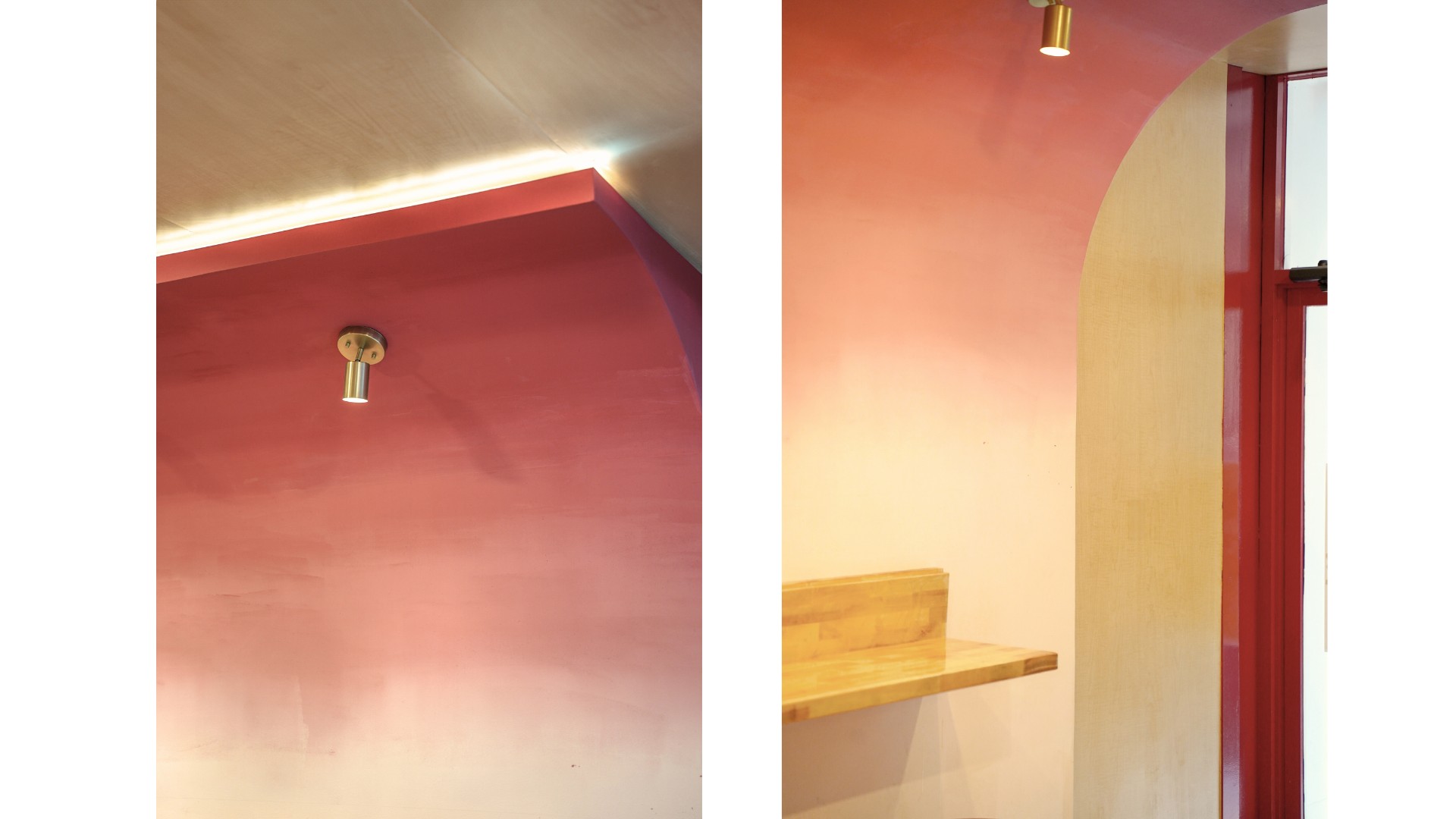 The space is carefully composed to resonate with office professionals seeking a sense of ease and familiarity during their daily routines. A signature red gradient wall anchors the interior, introducing warmth and subtle energy while creating a strong visual identity. This is balanced by light wood tones and soft material finishes, which bring a sense of calm, approachability, and home-like comfort.